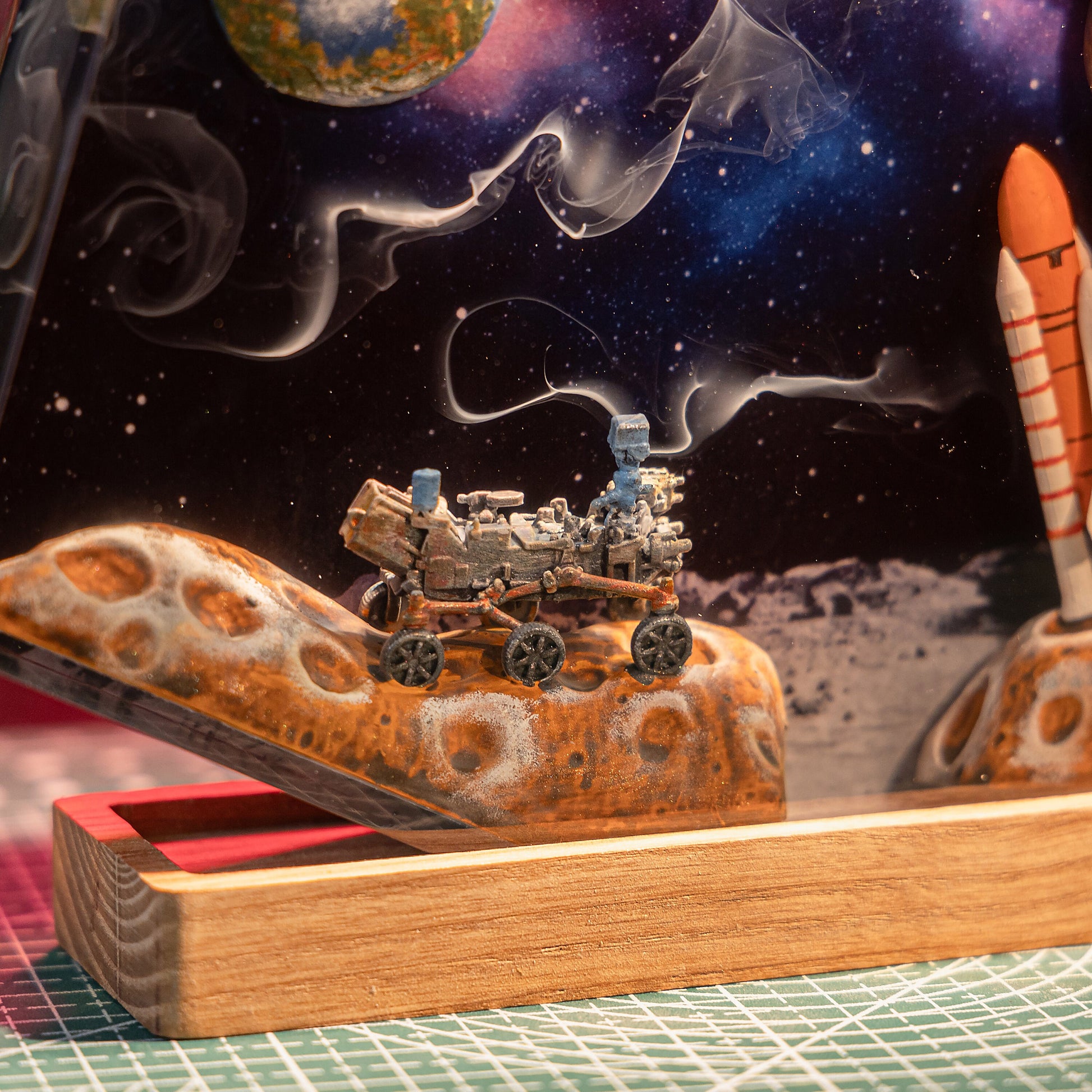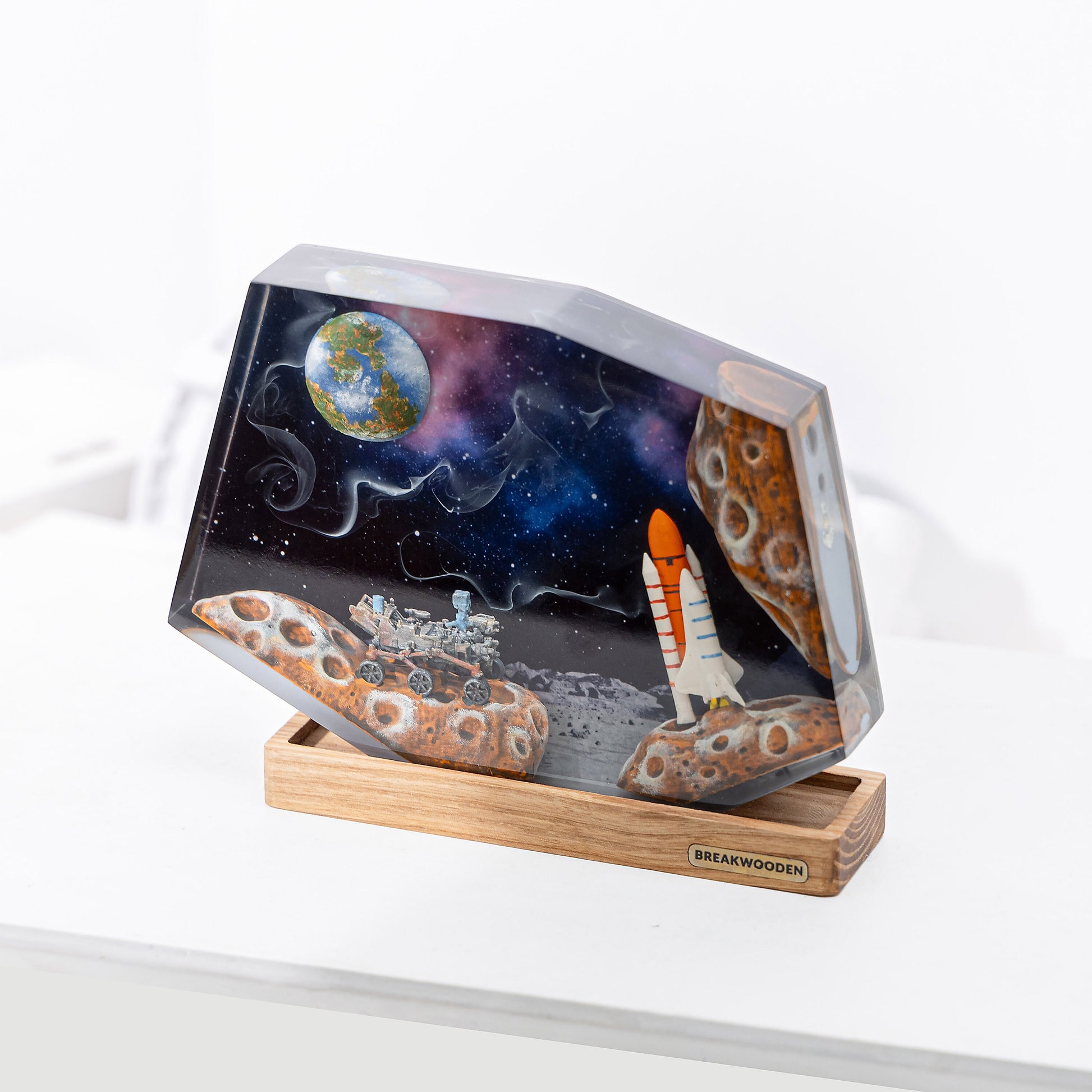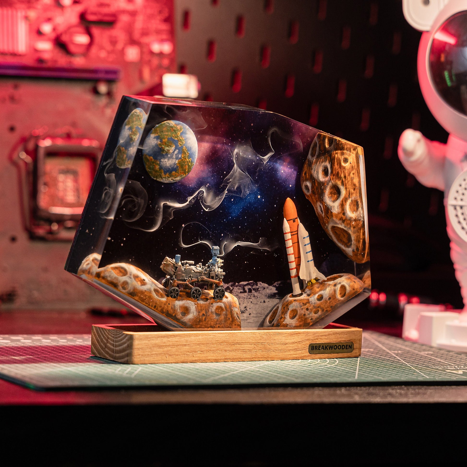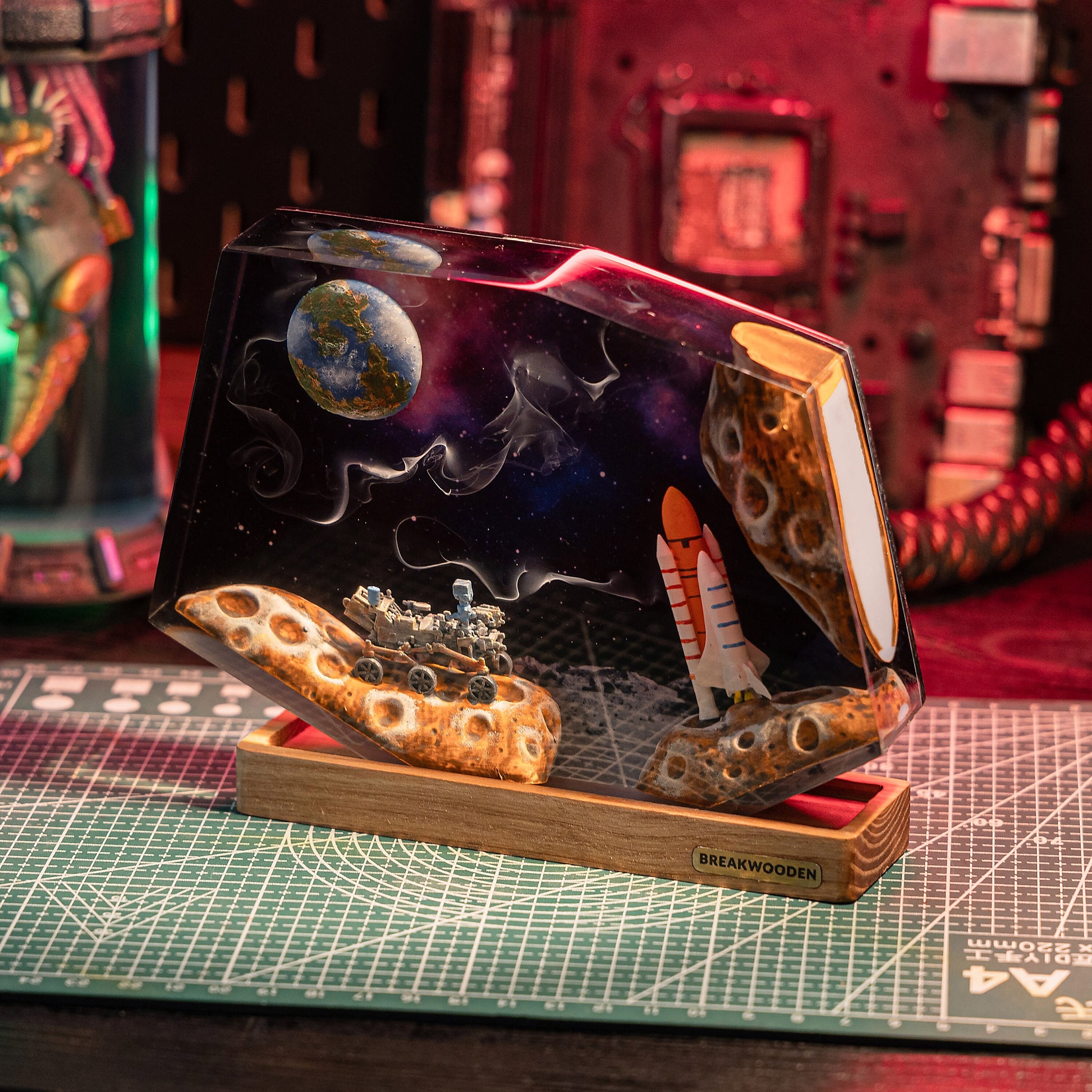 Step onto the surface of the Moon with this stunning epoxy resin lamp. Capturing the spirit of cosmic exploration, this handcrafted piece features a detailed lunar landscape, complete with a rocket, rover, and Earth floating above in a vivid nebula sky.